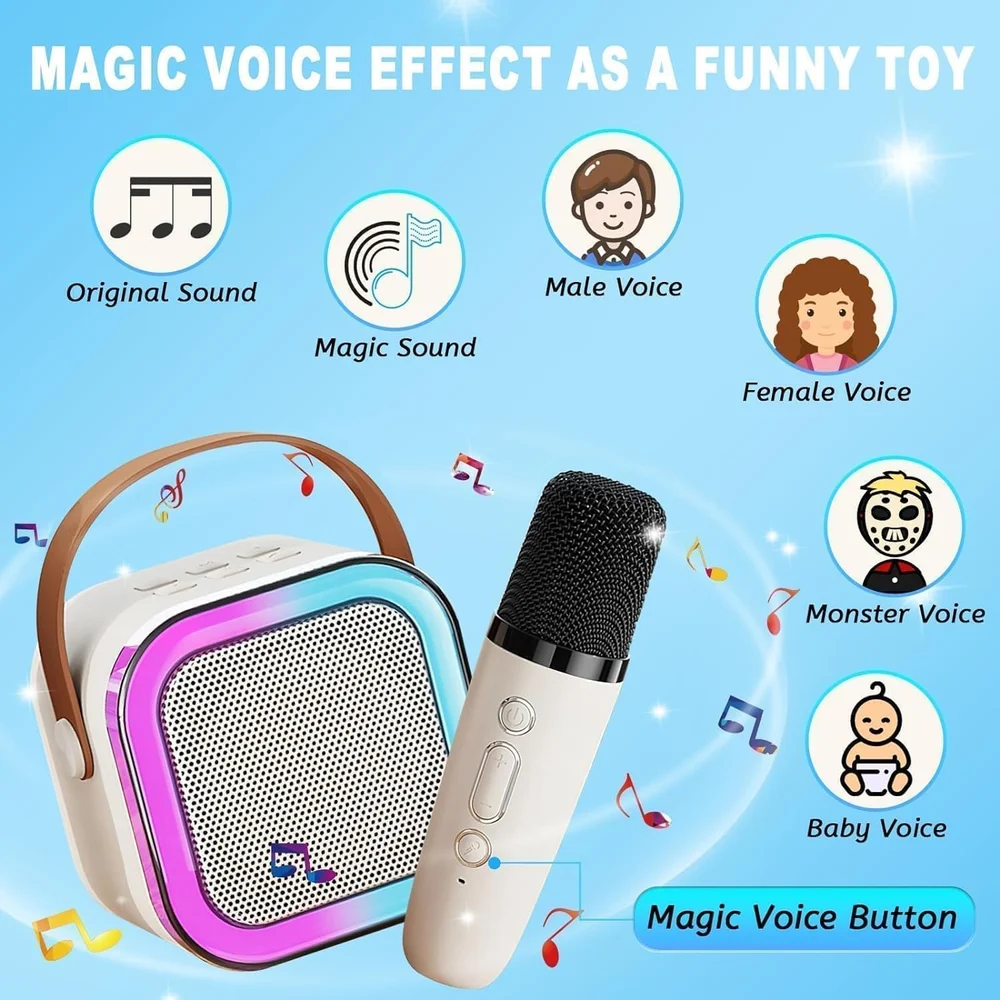 Featuring dual speaker output, adjustable microphone sensitivity, and 5 fun voice effects (Original, Female, Male, Baby & Monster), this mini karaoke machine lets users sing, laugh, and enjoy music like never before. The compact and lightweight design makes it easy to carry anywhere — from bedrooms and classrooms to outdoor picnics and travel trips.